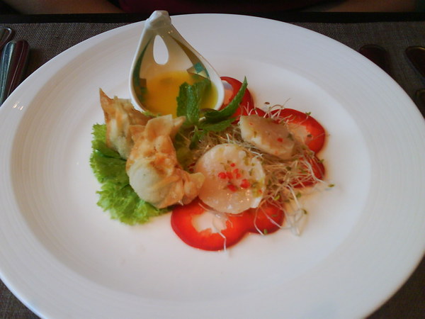 接下來是泡媽的前菜~ 聽說干貝還蠻好吃的~ 不過因為泡自己的菜單裡也有干貝,所以就沒有試吃~ 沾醬裡有放桔子汁所以酸酸的,泡媽說很開胃。