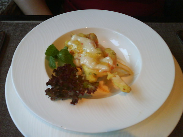 泡媽的沙拉~ 名字太長,泡媽已經記不得了~ 中間是兩支蝦子,用竹籤串起來去炸,泡媽說吃起來有像軟殼蟹,醬料弄得像美乃滋,不喜歡吃太油的人就不太適合~ 像泡媽都把醬撥到旁邊去了~