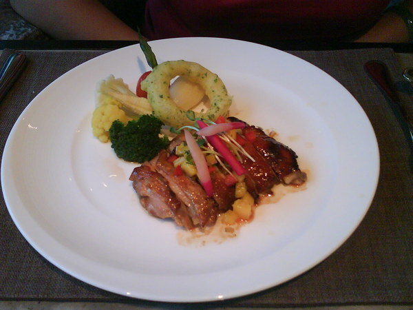 主菜,泡媽點的是夏威夷烤雞腿~ 不知道是不是為了反應夏威夷眾多的日本移民,所以還有附上日式的醃薑。泡有嚐了一口,但是泡不喜歡青黃椒的味道,至於雞腿本身...泡的感覺是普通,還沒有好到足以讓人留下特別的印象~ 沒有特別嫩、特別香,不過對不挑嘴的人來說應該已經是中上的水準了~