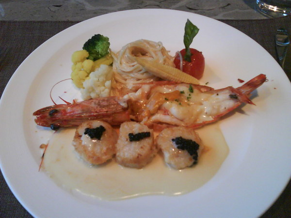 泡媽評價泡的主菜,說真的有票價的感覺~ 泡點的是海膽干貝鮮蝦~ 沒什麼花俏的名字,不過看起來還蠻不錯的^^ 附菜的Pasta是蒜頭奶油的味道~ 明蝦焗烤過後上面鋪上海膽,不過讓泡挑剔的說一下,泡覺得焗烤的奶油味有點搶掉海膽的鋒頭就是了~ 干貝上面的是魚子醬,一樣有點浪費~ 真正頂級的魚子醬實在是應該單吃才對~ 還有應該避免用金屬餐具食用魚子醬,其實應該是用吃冰淇淋的那種塑膠小湯匙吃,避免魚子醬帶上別的味道才好~