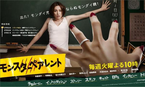 7/1開始的火10劇,則是米倉涼子擔綱的『モンスター・ペアレント(Monster Parents)』。最近幾年的確常有耳聞家長過度干預學校政策和老師教學的新聞~ 泡媽老是大嘆師道衰微~ 現在家長過度保護孩子的後果就是苦了學校的老師,綁手綁腳的教學行政都難做~ 這部劇似乎就是要討論這一部分的問題,不過微妙的是,米倉涼子的角色既不是學校老師,也不是學生家長,而是被聘雇的律師!! 內容就留給大家自己去觀看~ 泡之前上了官網,覺得這一部劇還蠻值得關注的~ 這也是泡喜歡日劇的一點,日劇喜歡把現在社會面臨的問題拿來當題材,大家在觀看之餘,可以反思ㄧ下,和觀眾也算是一種不錯的交流,同時也是教育觀眾不錯的方法~