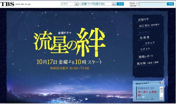 TBS的金10劇本請到傑尼斯的二宮和也、錦戶亮搭配上一季才剛和山下智久拍完『コード・ブル(Code Blue)』的戶田惠梨香擔綱『流星の絆(流星的羈絆)』,原作據說是2008上半年小說排行銷售第一的人氣作品。二宮、錦戶和戶田飾演的三兄妹,為了要對殺害父母的兇手進行復仇而展開一連串的調查與行動。是說,這兩季傑尼斯還真是大動作阿~ 前腳才送走大野智和生田斗真的『魔王』,這一季又馬上推出二宮和也和錦戶亮上陣,還真不是普通的忙碌阿~ 社長大人最近的策略是買一送一嗎?? 看來傑尼斯迷是要卯起來追這部囉??