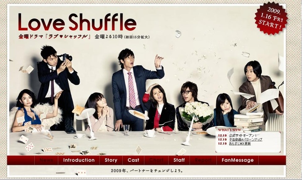 TBS推出的冬季劇碼裡,泡最想看的是由玉木宏、香里奈和松田翔太主演的金十劇『ラブシャッフル(Love Shuffle)』。這部戲卡司很齊全,『のだめカンタービレ(交響情人夢)』的千秋王子和『花より男子(日版流星花園)』的西門総二郎耶~ 泡超期待的~ 而且編劇是神級的野島伸司,光聽這個組合就很有保證的感覺~