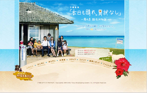 TBS另外推出日九的重頭戲『本日も晴れ。異常なし』由坂口憲二擔綱,找來松下奈緒搭檔。要演個從東京中央署調職到小島的警察故事~風平浪靜的小島上走溫馨路線的調嗎? 泡覺得故事線感覺和『コトー診療所(五島醫師診療所)』很像,收視率的話.... 泡認為可能會和『太陽と海の教室(太陽與海的教室)』很像吧?? 坂口憲二也和織田裕二很像呢~ 一樣黑黑的,很大一隻~ 演技的話... 因為不是泡的菜~ 泡沒很注意過,唯一一次有印象是坂口憲二和木村拓哉合作『Pride』那一次,不過那也是因為木村拓哉的關係阿~