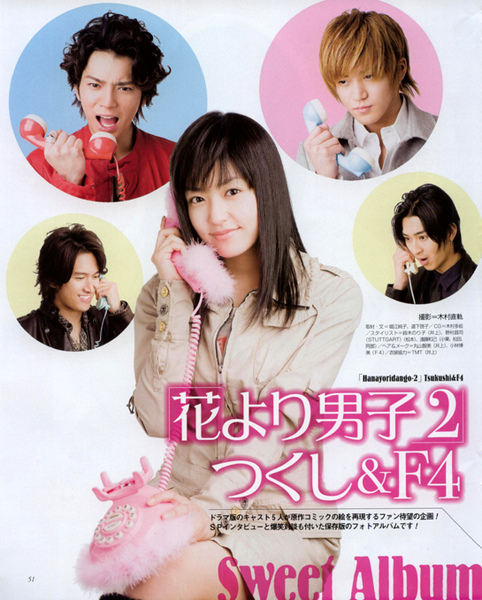 話又說回來,『花より男子(流星花園)』還真是一部歷久不衰的漫畫阿~ 其實早在台灣2001年推出台版『流星花園』之前,日本就已經在1995年拍過一次了!! 當年的F4分別是:道明寺→谷原章介,花澤類→藤木直人,美作あきら→橋爪浩一,西門総二郎→佐伯賢作。只不過四個人當中,好像最後也只紅了飾演花澤類的藤木直人而已,谷原章介現在也只能算中年型男中比較有露面的,至於其他兩位... 泡就不是很清楚現在到底過的如何了~ 不過2001年的台版,眾所周知的大成功!! 立刻捧紅了當年還是新人的四位男演員,也造成了台灣偶像劇的風潮。於是,日本於2005年再度嘗試將『花より男子(花樣男子)』搬上小螢幕,這次也得到很大的迴響,接著2007年再度開拍『花より男子2』並且在2008年將結局搬上大螢幕。2009開春,韓國KBS電視台則是推出了韓版的『꽃보다 남자(花樣男子)』,首播就得到了不錯的成績,預計也將在韓國掀起一陣熱潮。