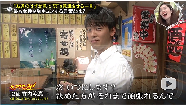 男友力爆棚被封「國民男友」的本事可不只這一點~ 竹內涼真在做《 帝一の國 (帝一之國)》宣傳時和同劇演員上了 Kis-My-Ft2 的節目,主題是讓一眾帥哥想想對讓年上女動心的一句話,然後給觀眾票選排名,這擺明了讓所有人拿出本事盡量撩,結果: